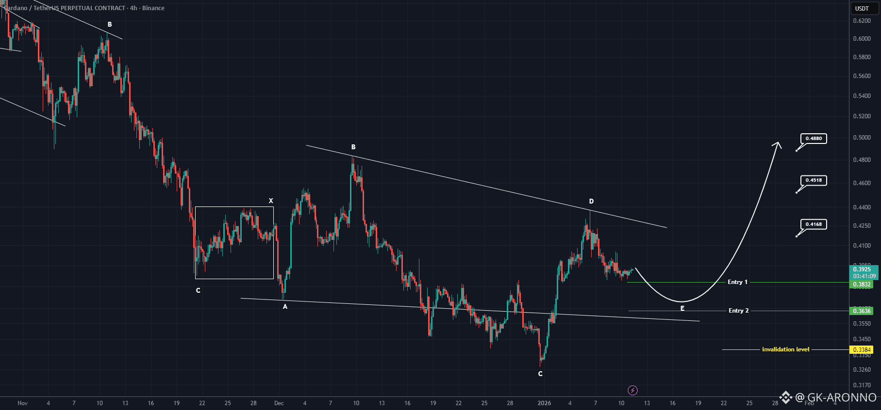 From a structural perspective, Cardano (ADA) seems to be forming a double correction, connected by an X-wave, linking the two corrective patterns together. The second correction, in particular, appears to take the form of a triangle, and we are currently observing Wave E of this triangle. Once Wave E completes, we can reasonably expect this double correction to conclude, setting the stage for a potential bullish move in Cardano.