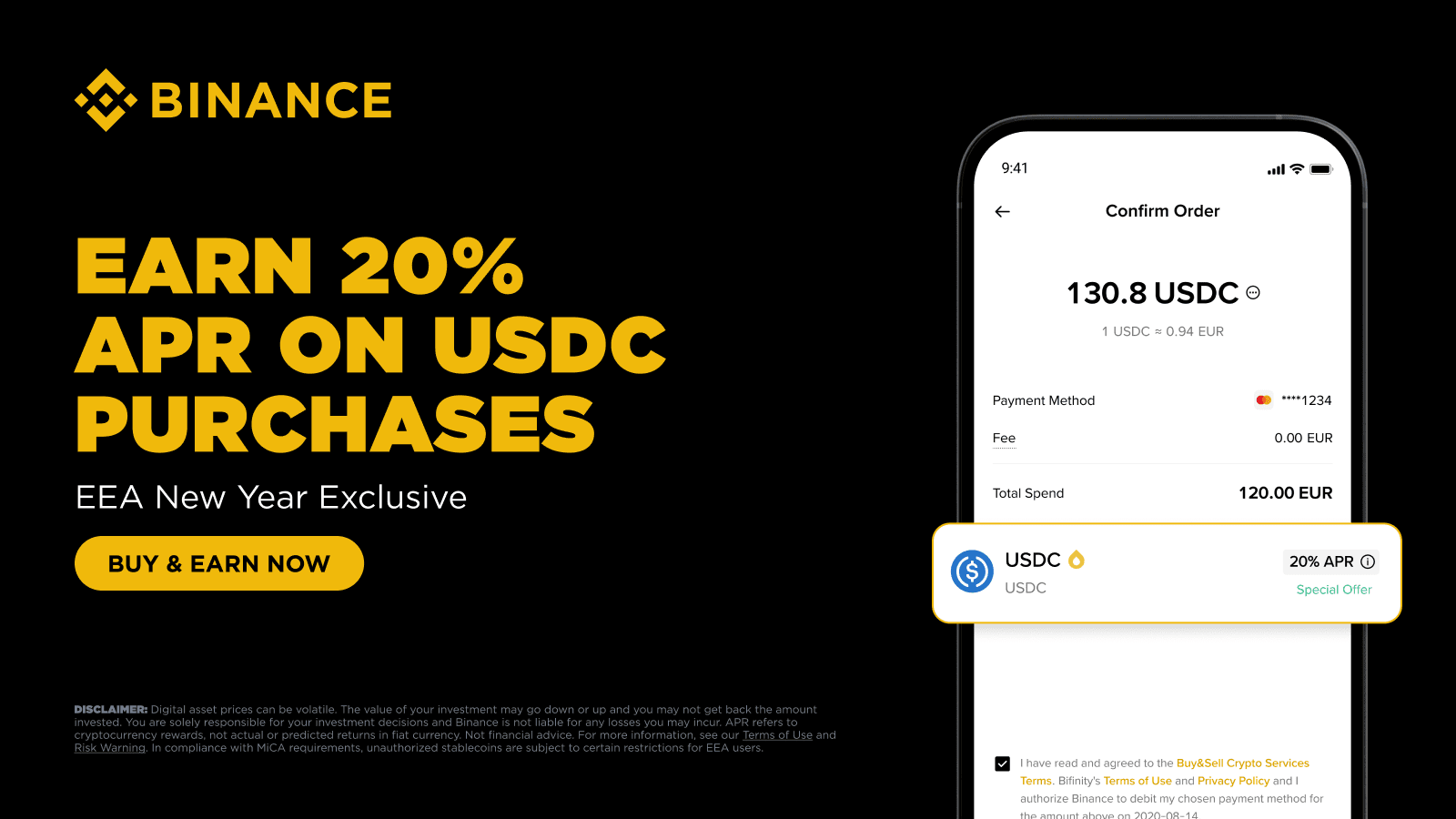 Binance is excited to launch an EEA exclusive promotion to celebrate the new year. During the Promotion Period, all EEA users who buy crypto and subscribe to Simple Earn USDC Flexible Products can enjoy up to 20% APR for 10 days, which includes an exclusive 19% Bonus Tiered APR on top of Real-Time APR rewards.