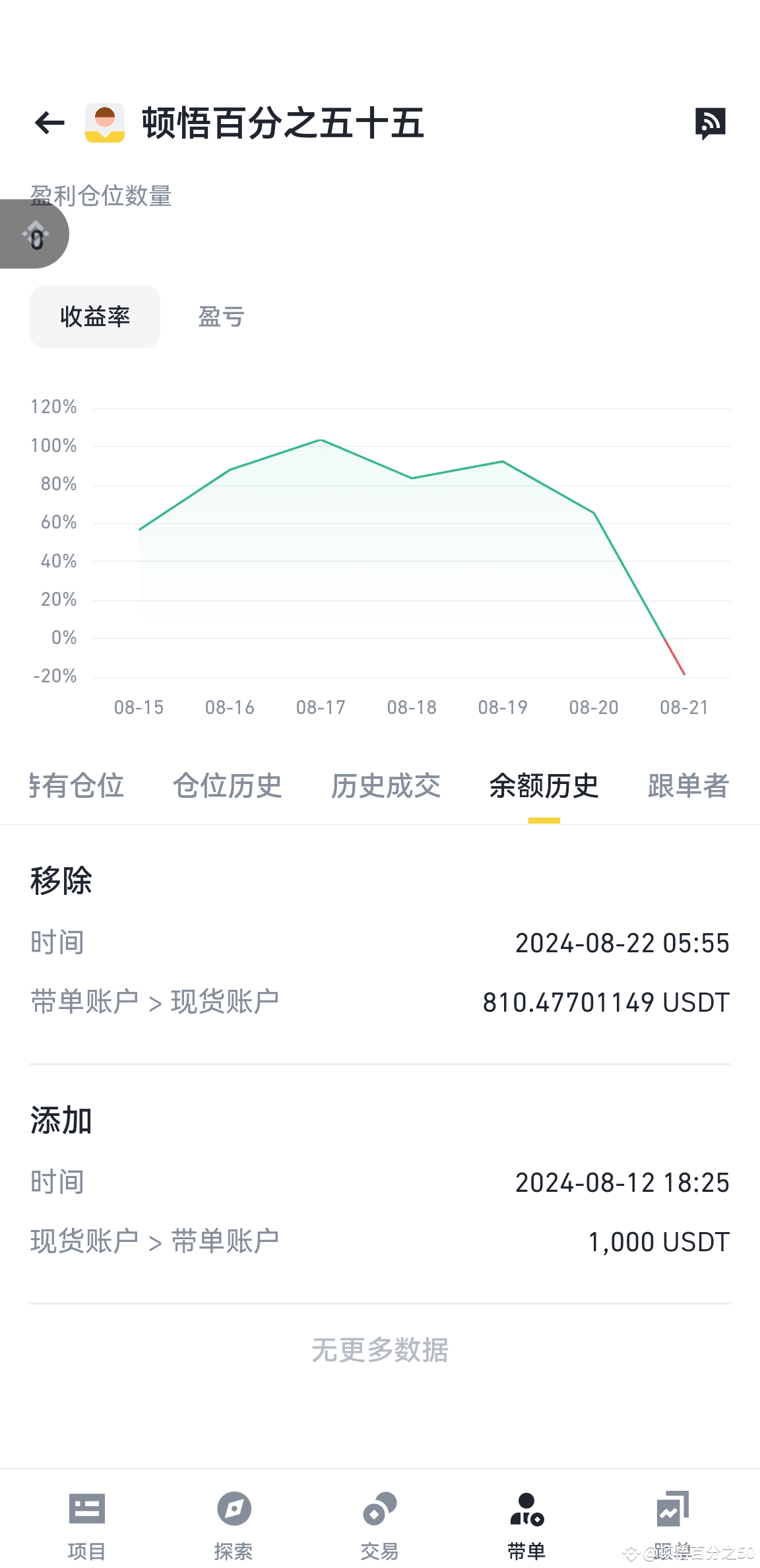 8月12日-22日,共11天,转入1000U,经历了本金翻倍到项目关闭,转出810U。