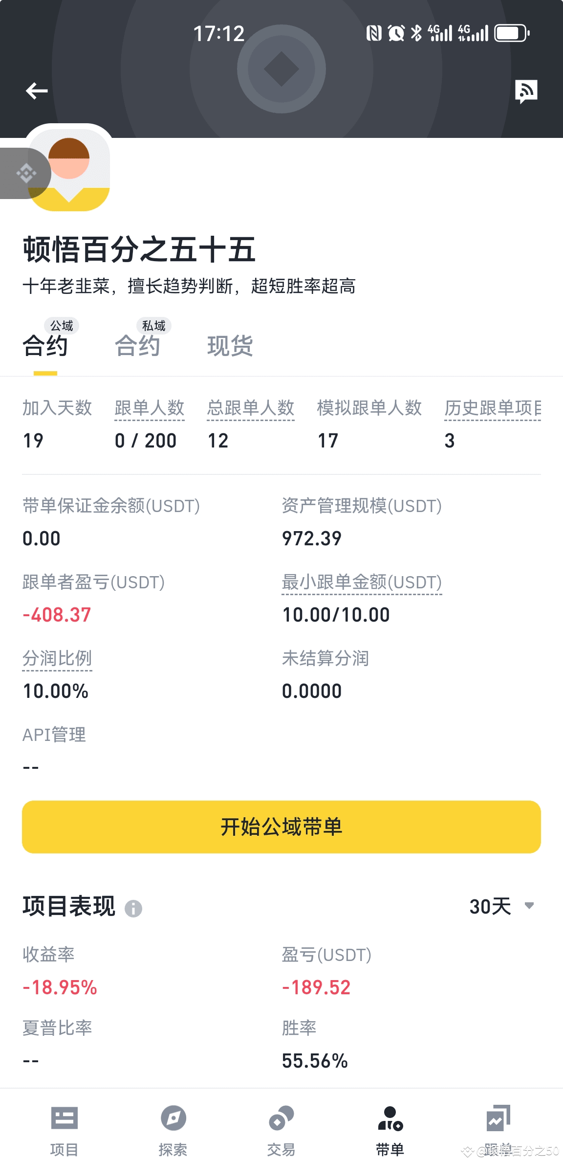 第一,合约难有长胜不衰,从我模拟跟单的经历来看,基本上能扛到三个月以上的,都很少见,但是作为带单员本身,其实是可以永赚的,简单来说,项目内带单开一单,项目外反向开一单,那么里外里只亏手续费,但是只要项目内的赚钱,那么至少分润跟单者10%的利润,所以开带单真心是个稳定盈利的好工具,只要忽悠的人够多,肯定赚钱,而且胆子要大,不需要止损,当然我还没有那么无耻,至少第一次没有这么干,但是当我合约止损的时候,我也是同步减持了现货,所以对于我来说,也不存在亏损,只有少赚