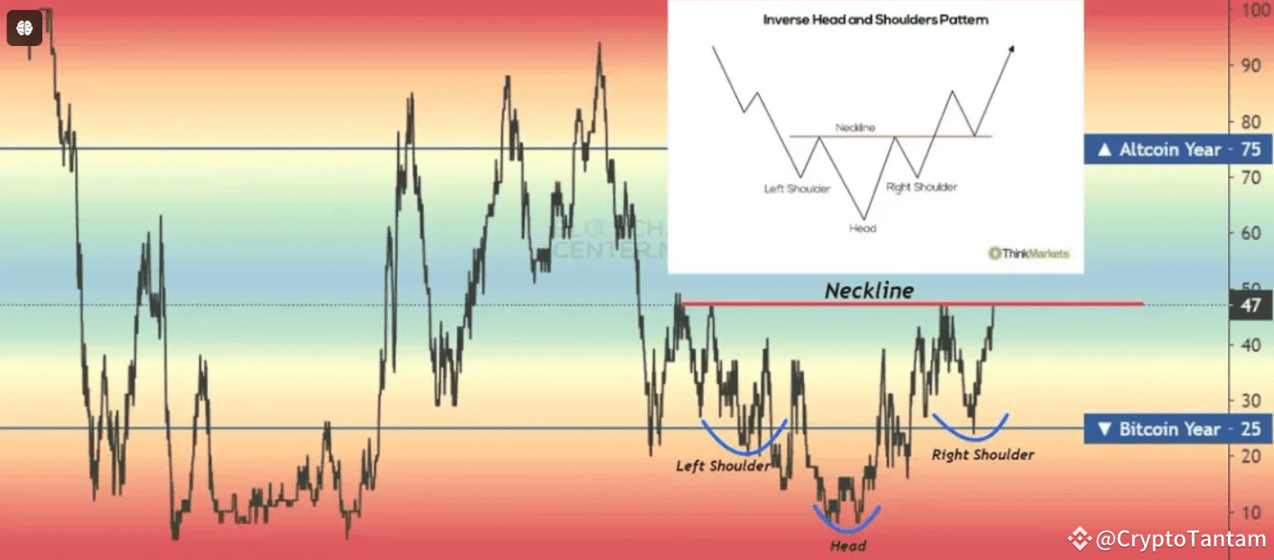 Chỉ số Altcoin Season Index đã kích thích sự quan tâm của các nhà đầu tư với mô hình biểu đồ đầu và vai ngược (IH&S) hình thành từ năm 2022 đến 2024, cho thấy sức mạnh của người mua đang gia tăng, có thể đồng nghĩa với sự giảm sút trong sự thống trị của Bitcoin (BTC).