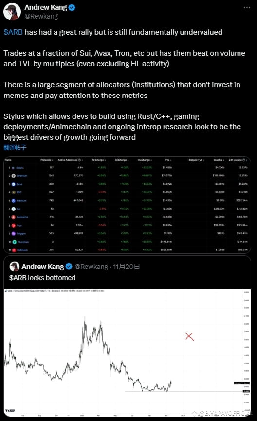 “ARB$ARB 现在有点像被低估的黑马。”——这是 Mechanism Capital 的合伙人 Andrew Kang 在 X 上发文时的直白点评。他指出,虽然 ARB(Arbitrum)最近的反弹表现强劲,但其交易价格依然只是 Sui、Avax 和 Tron 等项目的一小部分,然而,它的交易量和 TVL(总价值锁仓)却遥遥领先。