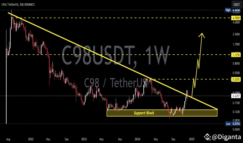 C98 has recently retested its key support level. This could be a great chance to accumulate this promising cryptocurrency.