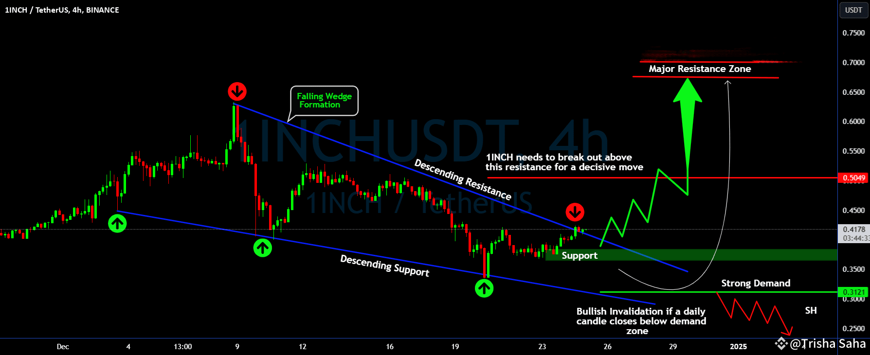 💎After an extended period of consolidation, #1INCHUSDT is forming a clear Falling Wedge pattern, a structure often hinting at a potential bullish reversal. The price is currently trapped between Descending Resistance and Descending Support, coiling tighter with each move. The question is—will the bulls finally step up to break free?