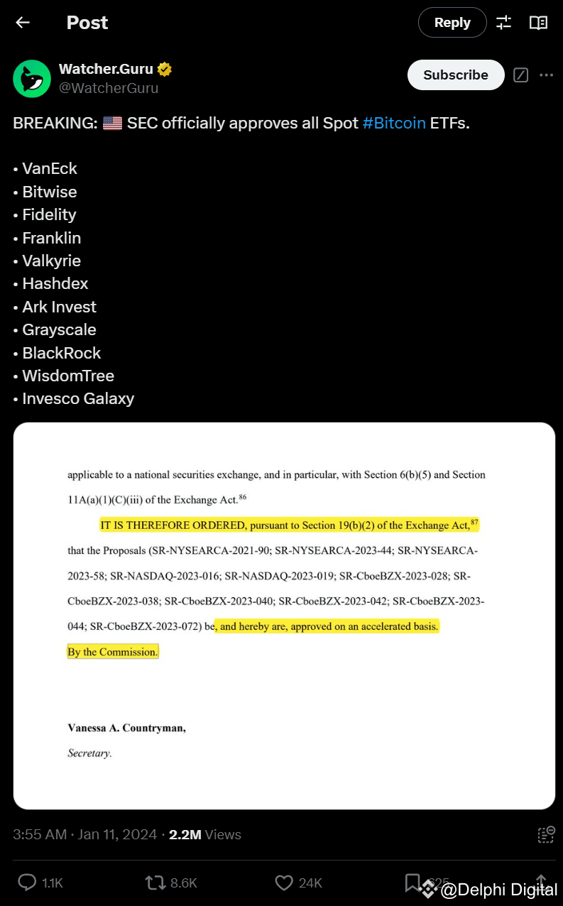 On January 11, 2024, the U.S. Securities and Exchange Commission (SEC) approved proposals to register Bitcoin Spot ETFs. These ETFs are from major fund management companies in the market, such as Ark Invest/21Shares, Bitwise, BlackRock, Fidelity, Franklin Templeton, Grayscale, Invesco, and more.