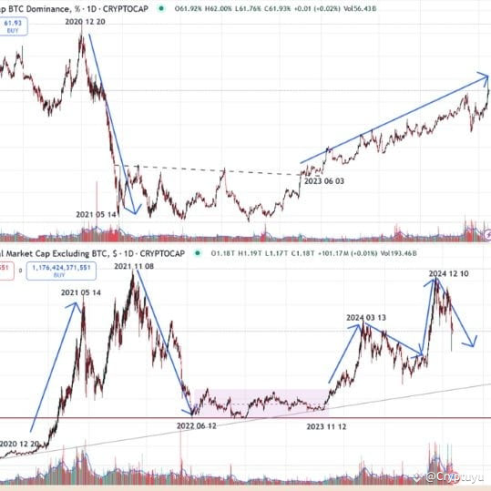 The BTC market value is the conspicuous yellow line, and the altcoin market value trend is the green and blue lines. Can you clearly see that the BTC yellow line and the altcoin green line are in opposite directions?