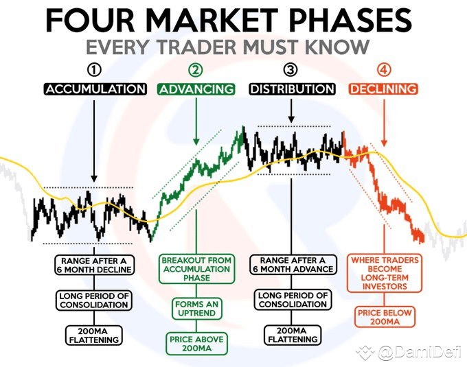 A typical cycle has clear phases — starting with quiet accumulation, then a strong uptrend as more investors jump in.