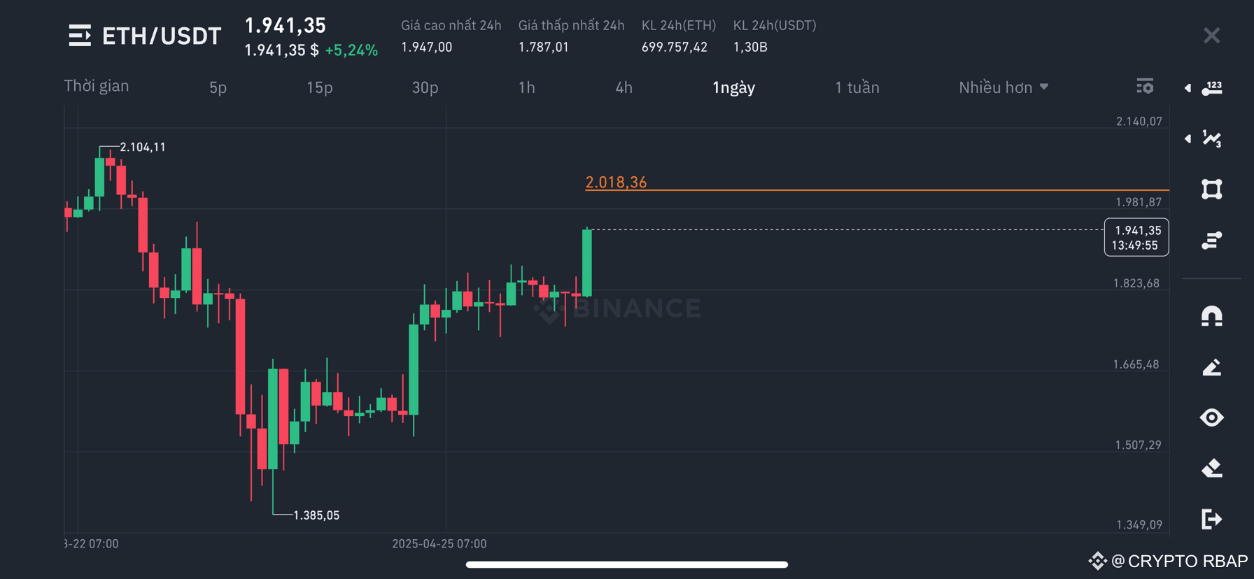 🔴 Hiện tại giá ETH đang ở ~1940 - mức tăng gần 9%. Mức phản ứng cần quan sát tại 2000.