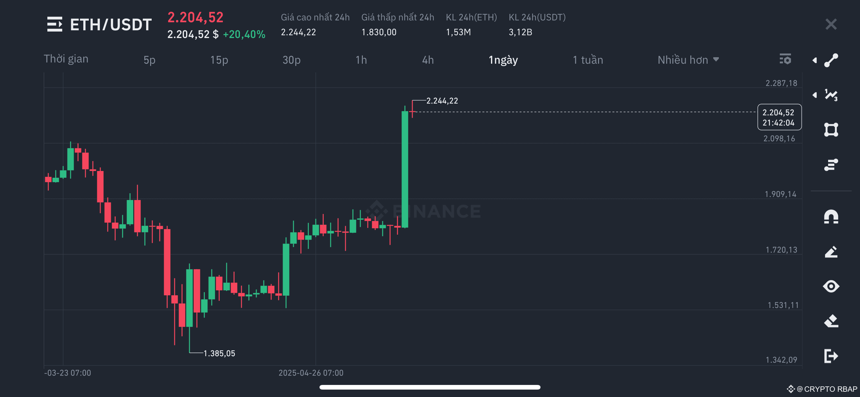 🟢 ETH ghi nhận mức tăng trưởng đột biến 21,4% trong phiên — mức tăng trong ngày mạnh nhất kể từ ngày 3/1/2021 — đưa giá giao dịch hiện tại lên $2.201, củng cố vị thế là đồng altcoin dẫn đầu thị trường.