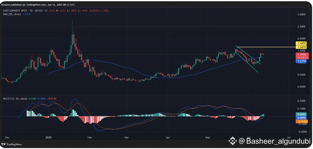 مخطط المتوسط ​​المتحرك البسيط (SMA) ومتوسط ​​التقارب والتباعد المتوسط ​​(MACD) لعملة FARTCOIN لخمسين يومًا - ١٢ يونيو