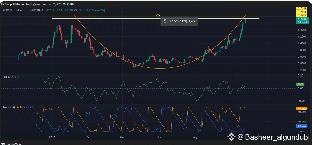 يبدو أن السعر على وشك ملامسة الحد العلوي عند ١.٧٤٢ دولار أمريكي. بمجرد وصوله إلى الهدف، إذا تراجع قليلاً ليشكل "المقبض" وحافظ على مستوى الدعم، فقد يُمهّد ذلك الطريق للموجة الصعودية التالية.
