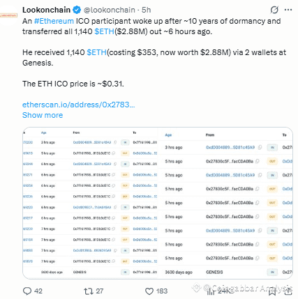 An Ethereum whale just woke up after nearly a decade of inactivity, and it's turning heads across the crypto industry. Around six hours ago, this early ICO participant moved all 1,140 ETH, now worth about $2.88 million, out of two Genesis wallets as reported by the Lookonchain. Back in 2015, the total cost of that ETH was just $353. Which makes a percentage increase of almost 81,500%.