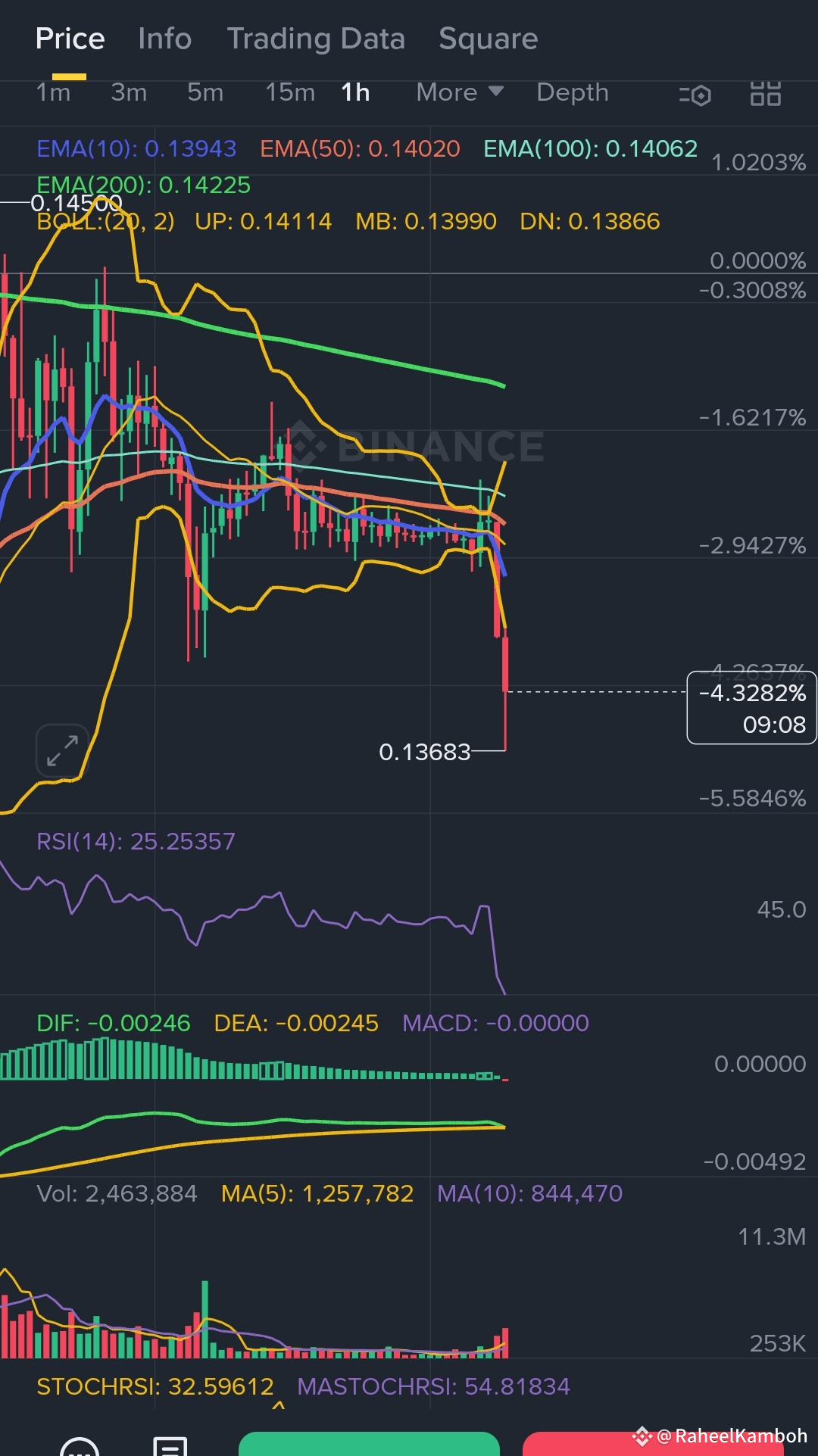 - **Bollinger Bands (20,2):** Price hugging LOWER BAND (0.13748). Squeeze incoming!