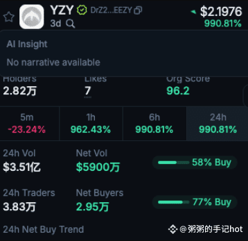 消息一出,市场立刻疯狂,YZY 的持币地址在短短四十分钟内就飙升到 2.82 万个,价格也在瞬间冲高到 3.43 美元。但好景不长,半小时内就跌回了 1.8 美元。