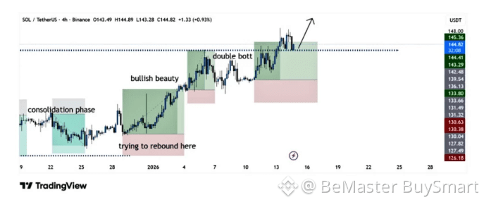 👉 The chart shows SOL spent multiple sessions stuck in a tight range before catching a bid near the lower edge around the mid-$120s. From that base, price bounced hard, creating a bullish structure with higher lows stacking up. The double bottom took shape during this recovery, showing persistent buying interest and cutting off any deeper pullbacks. That pattern led to follow-through that pushed SOL into the mid-$140s.