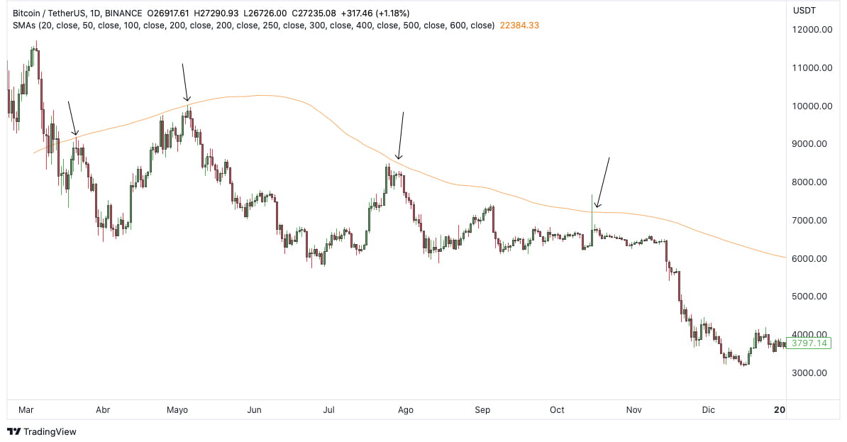 En el siguiente ejemplo vemos la Media Móvil Simple de 200 periodos en el gráfico de ADA (Cardano). Desde su rotura al alza, actúa de manera repetida como soporte, además de indicar que nos encontramos en una tendencia alcista de largo plazo.