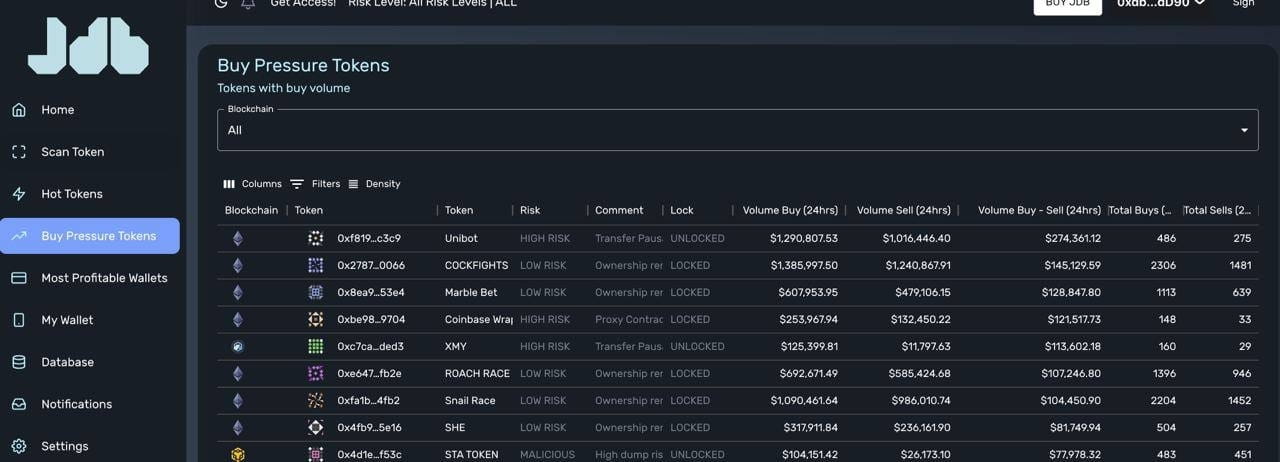 The core strength of JDB lies in the depth and breadth of our data analysis. Their powerful engine scans through millions of transactions and filters them based on factors such as profitability, risk level, liquidity, and more. But that’s not all – JDB also categorizes wallet addresses into "Most Profitable Wallets" (MPWs) and provides visibility into their trading behavior.