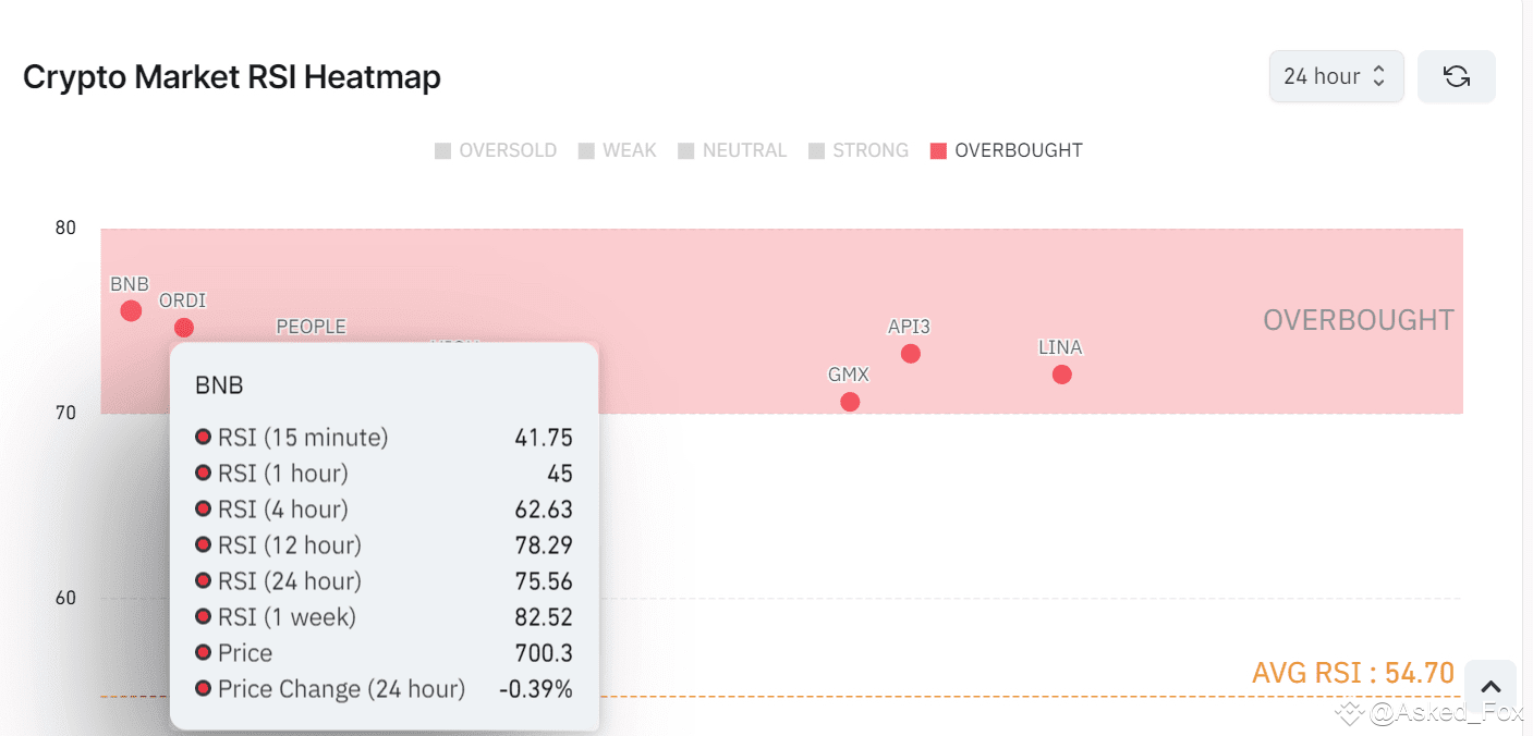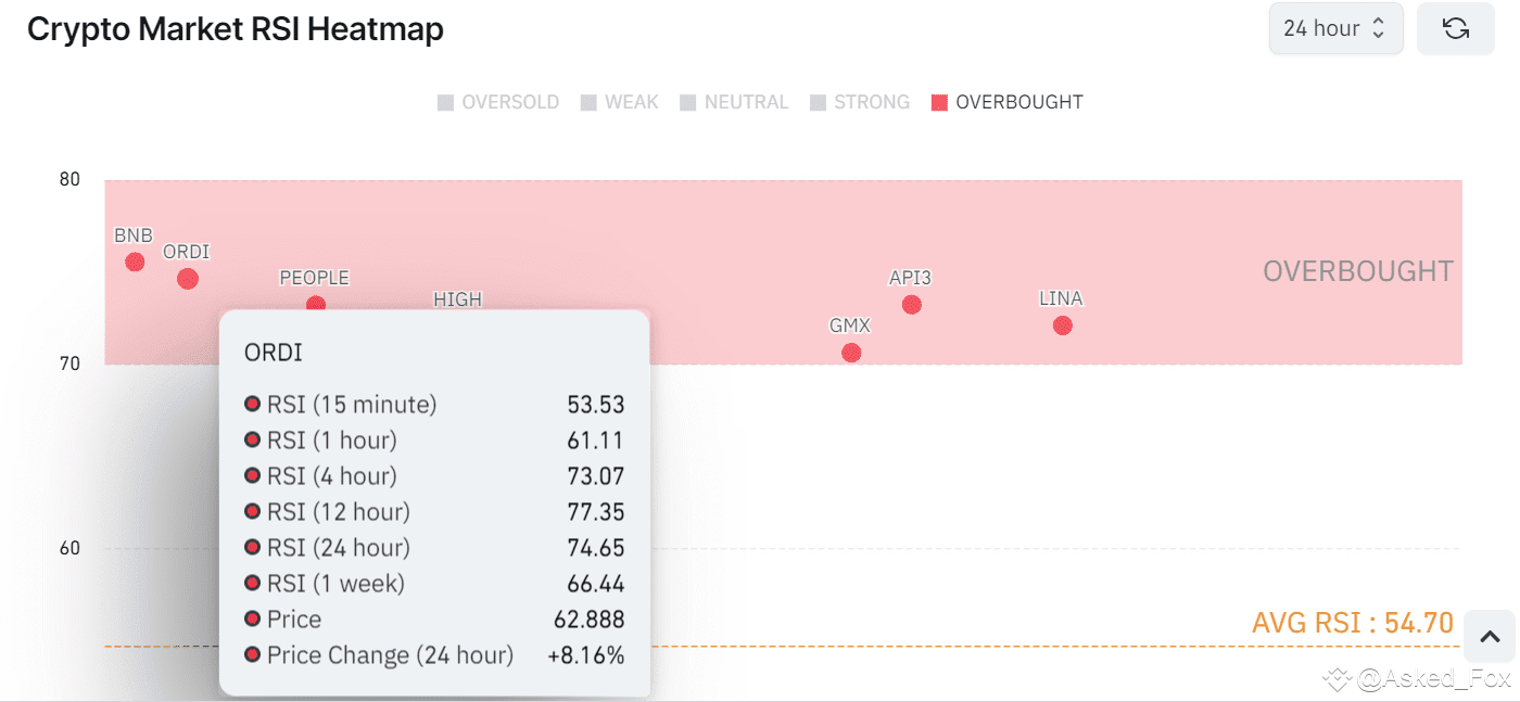 Криптовалютний ринок зараз перебуває в стані змін під впливом ширших економічних факторів. Останні дані показали дивовижне зростання кількості робочих місць у США, що значно перевищило очікування.Це означає, що економіка добре справляється з вищими процентними ставками, зменшуючи ймовірність зниження ставок, що впливає на потік грошей у більш ризиковані інвестиції, такі як криптовалюти.Зважаючи на цю економічну ситуацію, дві криптовалюти, які наразі перекуплені, можуть представляти гарну можливість для продажу.На основі 24-годинної теплової карти CoinGlass щодо індексу відносної сили (RSI) 7 червня середньодобовий RSI становить 54,70, що вказує на нейтральний ринок. Однак криптовалюти, які значно відрізняються від цього середнього.🔸 Binance Coin (#BNB )На момент публікації Binance Coin (BNB) коштує 700,30 доларів США з невеликим падінням ціни на 0,39%. Значення RSI BNB за різні періоди часу показують, що він перекуплений, особливо за останні 24 години.24-годинний RSI для BNB становить 75,56, що перевищує поріг перекупленості в 70. Це вказує на сильний купівельний тиск, який може бути нестійким.1-тижневий RSI 82,52 свідчить про тривалу перекупленість, що вказує на потенційну корекцію ціни. BNB нещодавно досяг історичного максимуму, підкреслюючи можливу переоцінку та насиченість ринку.🔸 Орді (#ORDI )ORDI, перший токен, викарбуваний за стандартом BRC-20, також продемонстрував значні зміни ціни. Зараз ціна ORDI становить 62 888 доларів США, що відображає зростання на 8%. Значення RSI ORDI також свідчать про перекупленість.24-годинний RSI для ORDI становить 74,65, що вказує на те, що нещодавно його перекупили. ORDI піднявся майже на 17%, досягнувши трохи нижче 57,5 ​​доларів, що є найвищою ціною з початку квітня.Це швидке зростання в поєднанні з високими значеннями RSI свідчить про те, що ORDI незабаром може побачити корекцію ціни, коли ринок стабілізуєтьсяІ BNB, і ORDI демонструють високі рівні RSI, сигналізуючи про те, що вони зараз перекуплені та можуть бути готові до корекції ціни.
