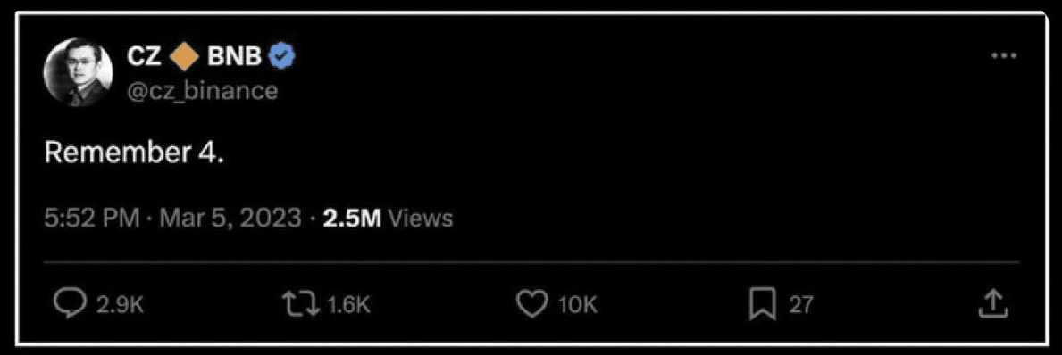 Když byl CZ v roce 2023 stále velmi aktivní na Twitteru, zveřejnil velmi slavný tweet: