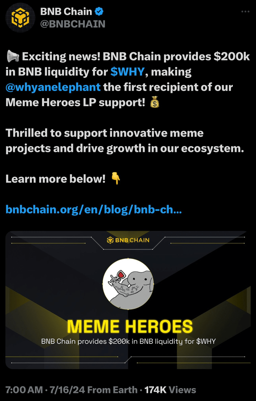 Pozoruhodným příkladem je $WHY @whyanelephant O tomto meme coinu se dříve na trhu příliš nediskutovalo, ale v poslední době stále získává na popularitě, protože se stal prvním příjemcem podpory meme Heroes LP Binance Chain.