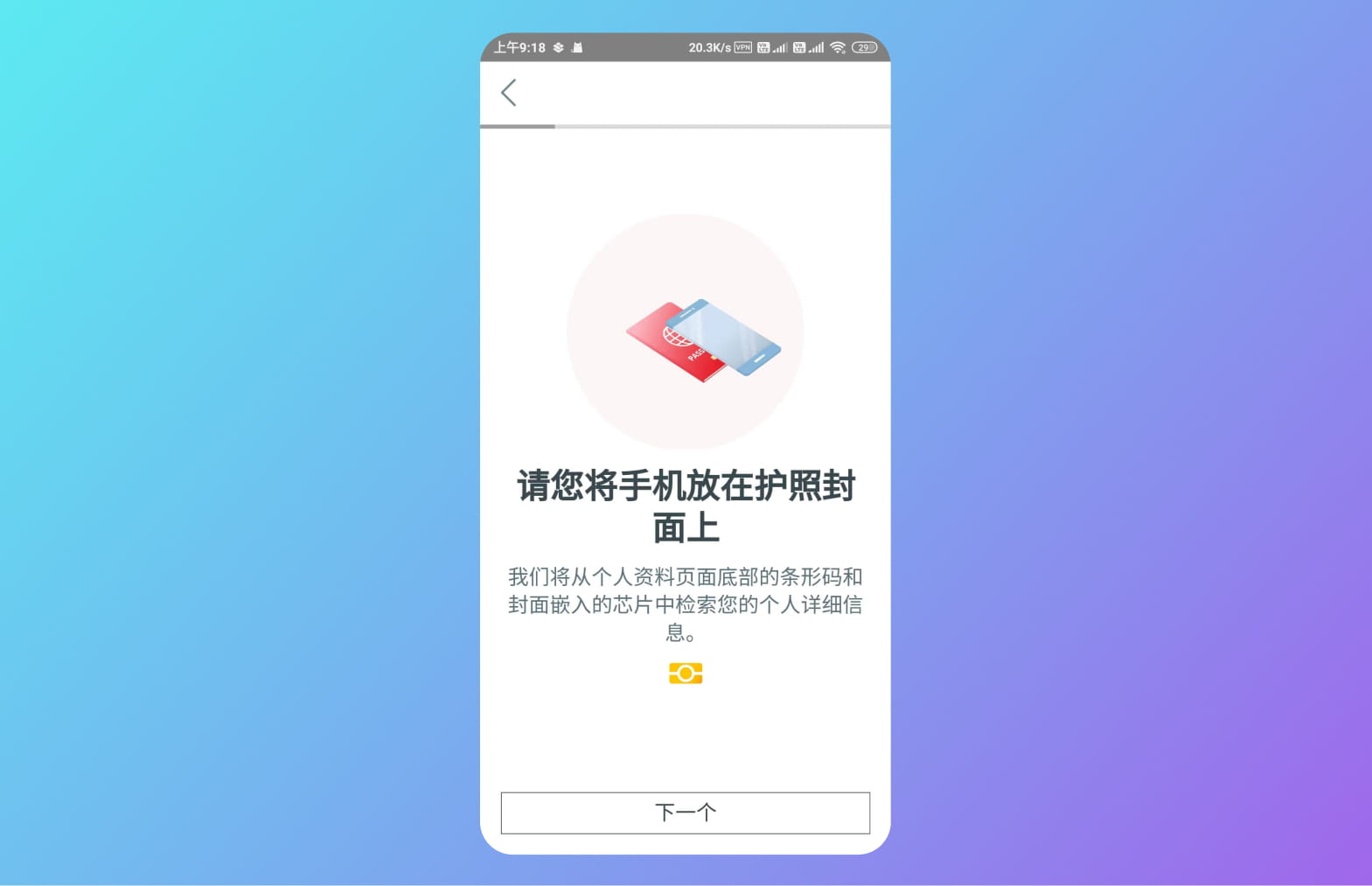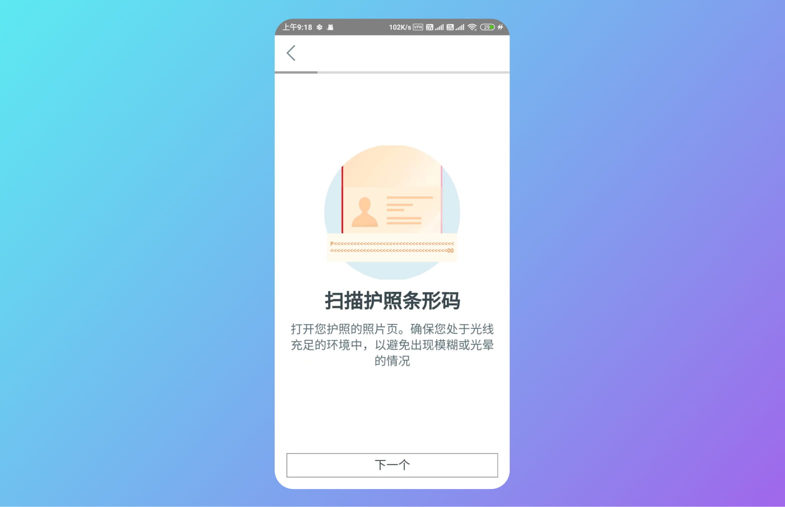 Klikněte na tlačítko Další a naskenujte čárový kód pasu. V tomto kroku otevřete pas na stránce s vaším portrétem a naskenujte jej telefonem na dobře osvětleném místě.