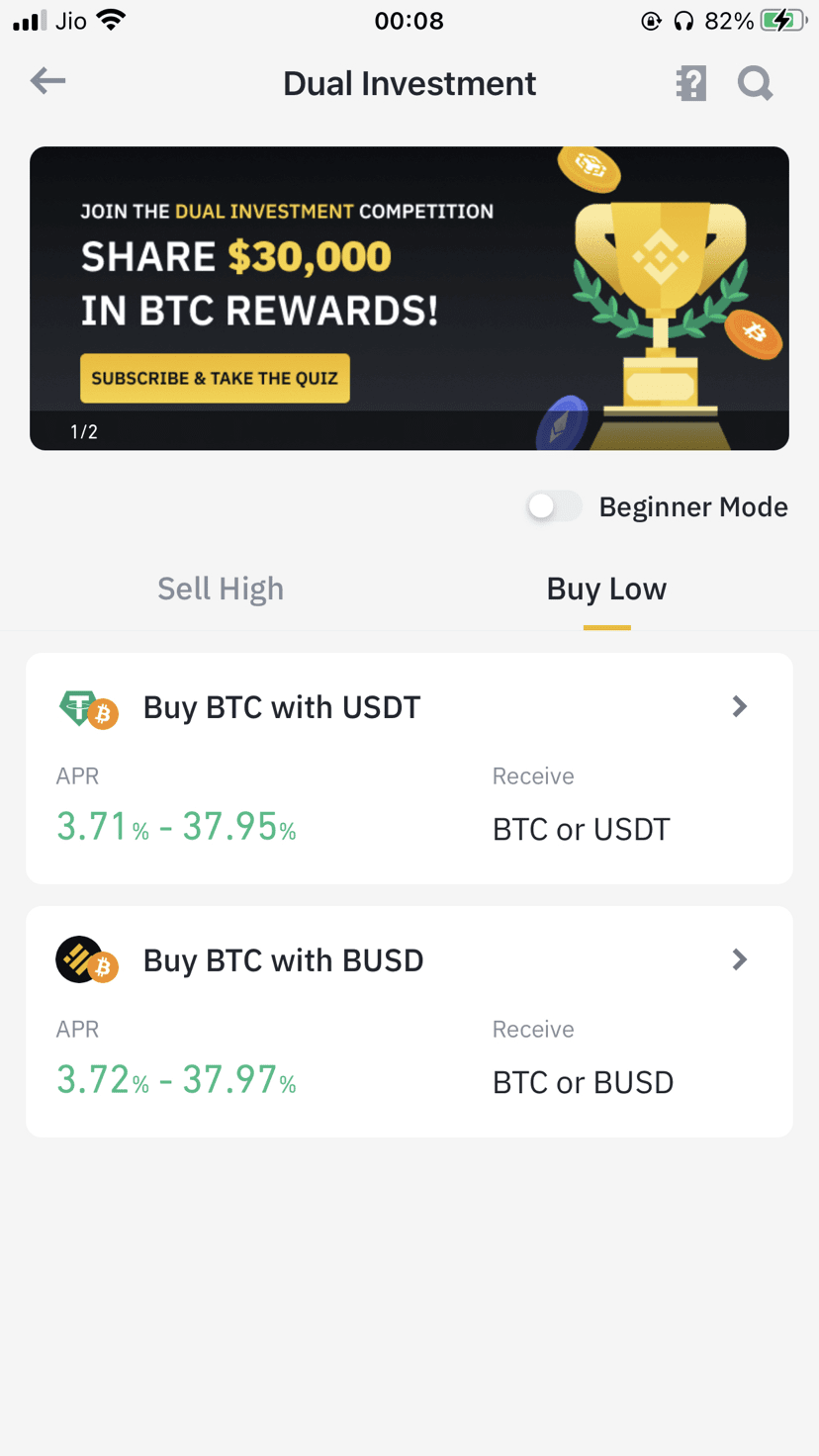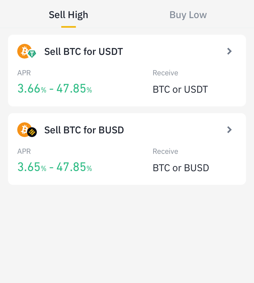 Duální investice je produkt vydělávání Binance, který vám pomáhá nakupovat vysoko nebo prodávat nízko spolu s výdělkem RPSN.