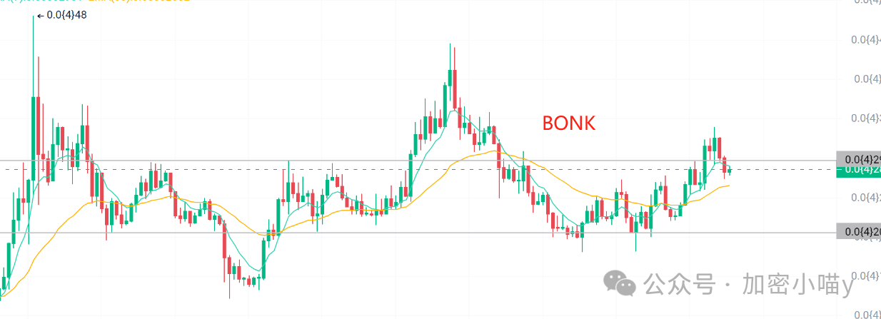 Výkon BONK je prostě šílený! Za pouhé dva týdny získal 50 %, prolomil se nad 50denní EMA a nyní cílí na Fibonacciho úroveň 0,00003217 $. Jak objem obchodů neustále roste, zdá se, že hranice 0,000055 USD je snadno prolomitelná a může dokonce dosáhnout nového maxima a dosáhnout 0,00008321 USD!
