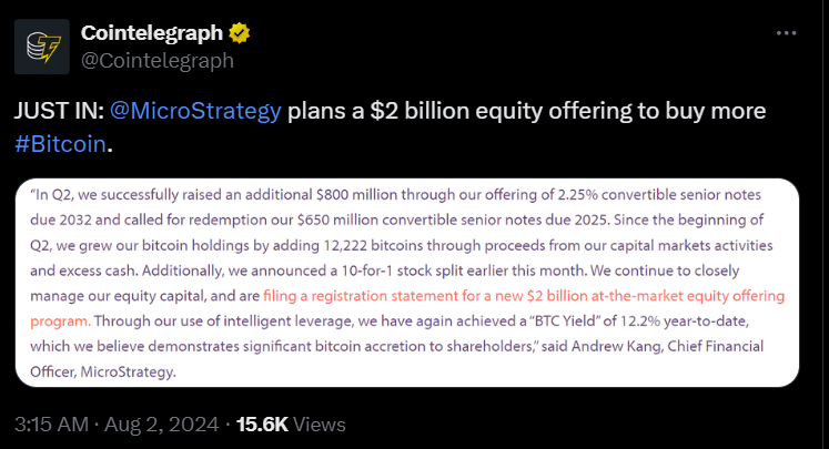 MicroStrategy, americká softwarová firma vedená generálním ředitelem Michaelem Saylorem, opět hýbe světem kryptoměn. Navzdory tomu, že ve druhém čtvrtletí společnost vykázala čistou ztrátu, oznámila, že plánuje získat ohromující 2 miliardy dolarů na nákup dalších bitcoinů $BTC , jak uvádí Cointelegraph.