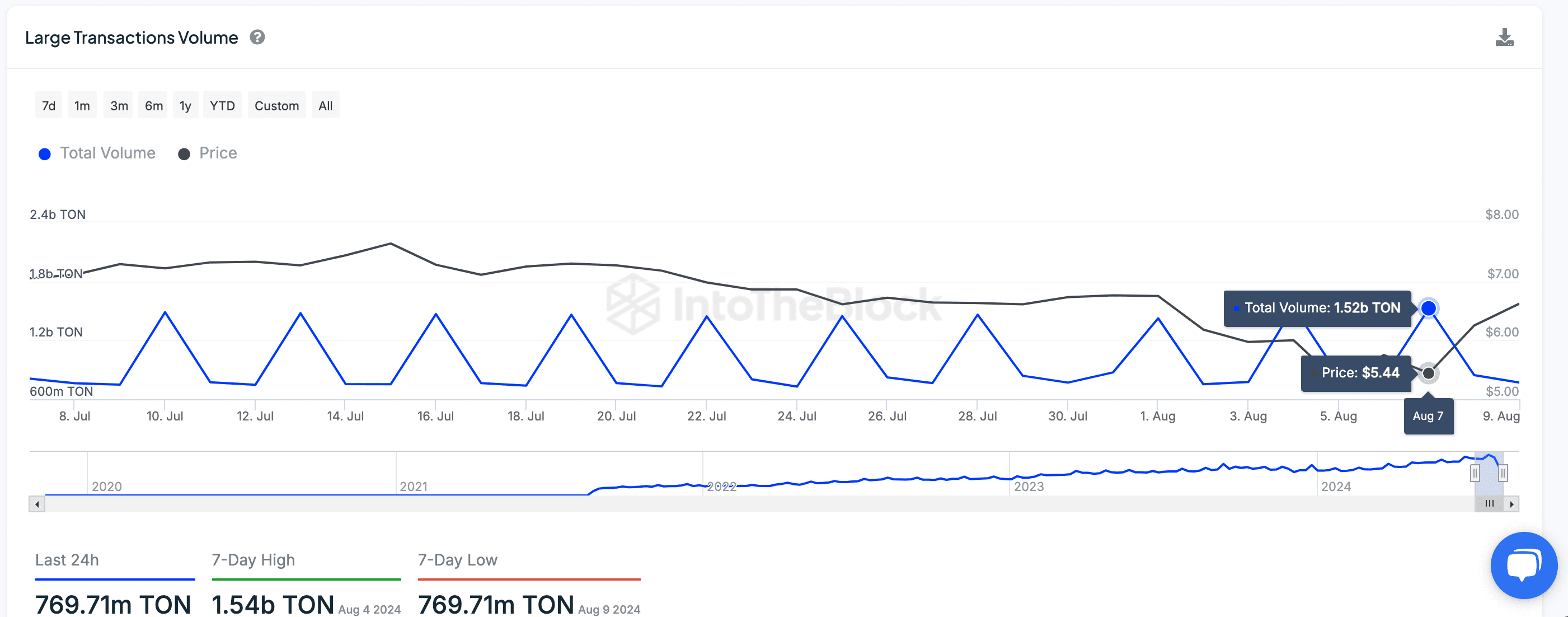 Mezi 7. srpnem a 8. srpnem, zatímco cena TON vzrostla o dalších 7 %, objem velkých transakcí klesl z 1,52 miliardy TON na 769 milionů TON. Tento pokles naznačuje, že poptávka po velrybách se snížila přibližně o 5,2 miliardy dolarů, na základě současné ceny 6,8 dolarů za tunu.