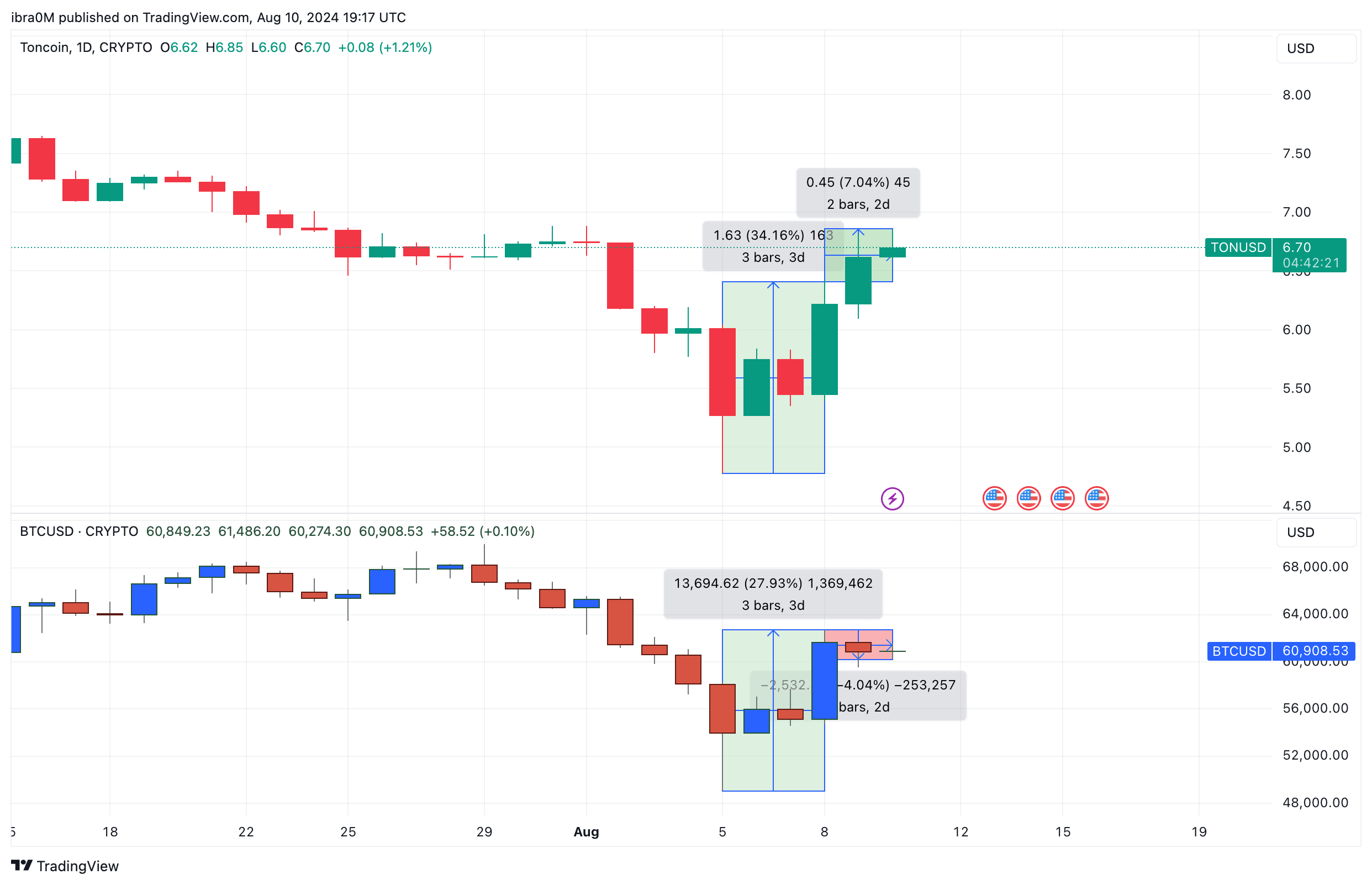 Za posledních 48 hodin TON prodloužil svůj 34% odraz z propadu trhu 5. srpna o dalších 7 %, mezitím 28% vzestup bitcoinu byl utlumen korekcí o 4 %.