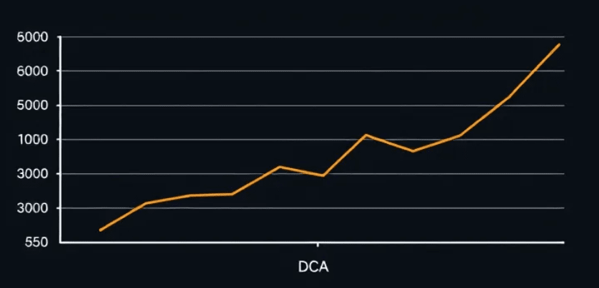 Dollar-Cost Averaging (DCA) je investiční strategie, kdy investujete fixní množství peněz do konkrétní kryptoměny v pravidelných intervalech bez ohledu na její cenu. Místo toho, abyste se pokoušeli předpovídat maxima a minima trhu, jednoduše se zavážete investovat stejnou částku pravidelně – ať už je to týdenní, dvoutýdenní nebo měsíční.