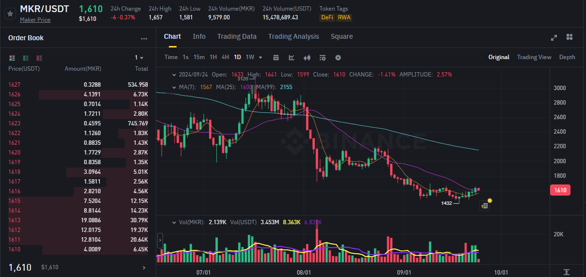 Během stejného období síťová aktivita na protokolu Maker raketově vzrostla, což přispělo k opětovnému testování ceny 1 500 USD. Aktuálně se MKR obchoduje za 1 600 USD. Přestože je MKR stále výrazně pod svým historickým maximem, vyčnívá jako jeden z potenciálních RWA coinů v říjnu. Toto je příležitost k rybolovu při dně pro investory, kteří mají zájem vlastnit tento mocný token
