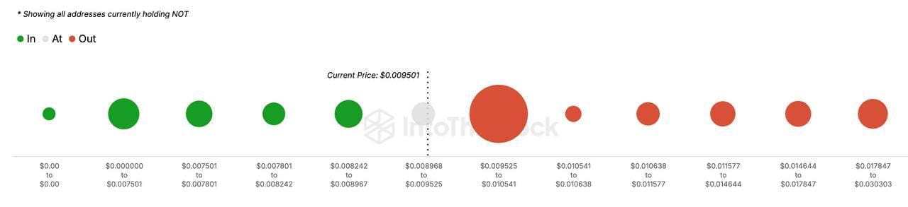 Držitelé Notcoinů, kteří nakupovali NOT za ceny mezi 0,0095 a 0,012 USD, v současné době ztrácejí peníze. Pokud aktivum opět dosáhne 0,012 USD, bude v zisku 62 miliard tokenů.