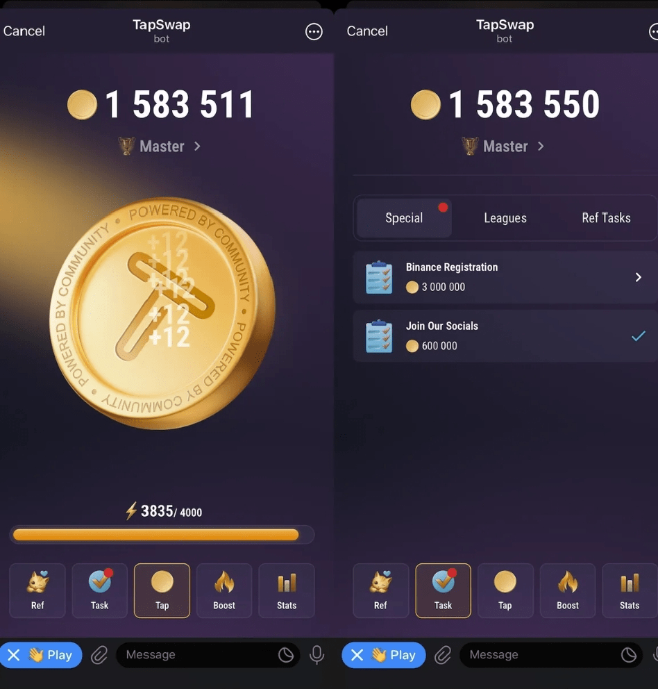 Hráči mohou také získávat bonusové body plněním speciálních úkolů, jako je připojení se ke komunitě sociálních sítí TapSwap nebo registrace na výměnný účet Binance (včetně KYC). Kromě toho vám doporučení přátel může získat bonusové body – nejen počáteční odměnu, ale také mince na základě jejich aktivity ve hře.