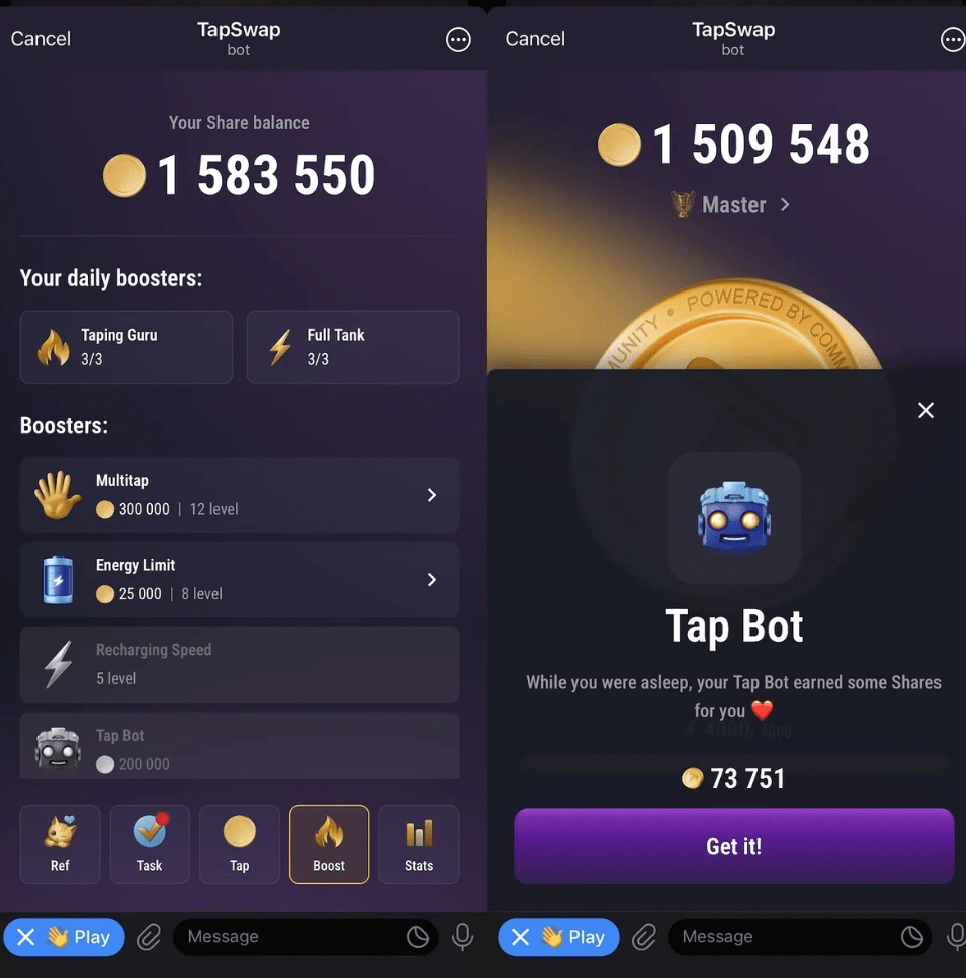 TapSwap také nabízí vylepšení. Každý den dostanou hráči zdarma tři boostery „Tapping Guru“ a „Full Tank“. Tapping Guru zvyšuje body za klepnutí, zatímco Full Tank doplní energetickou tyčinku, což vám umožní klepnout více.