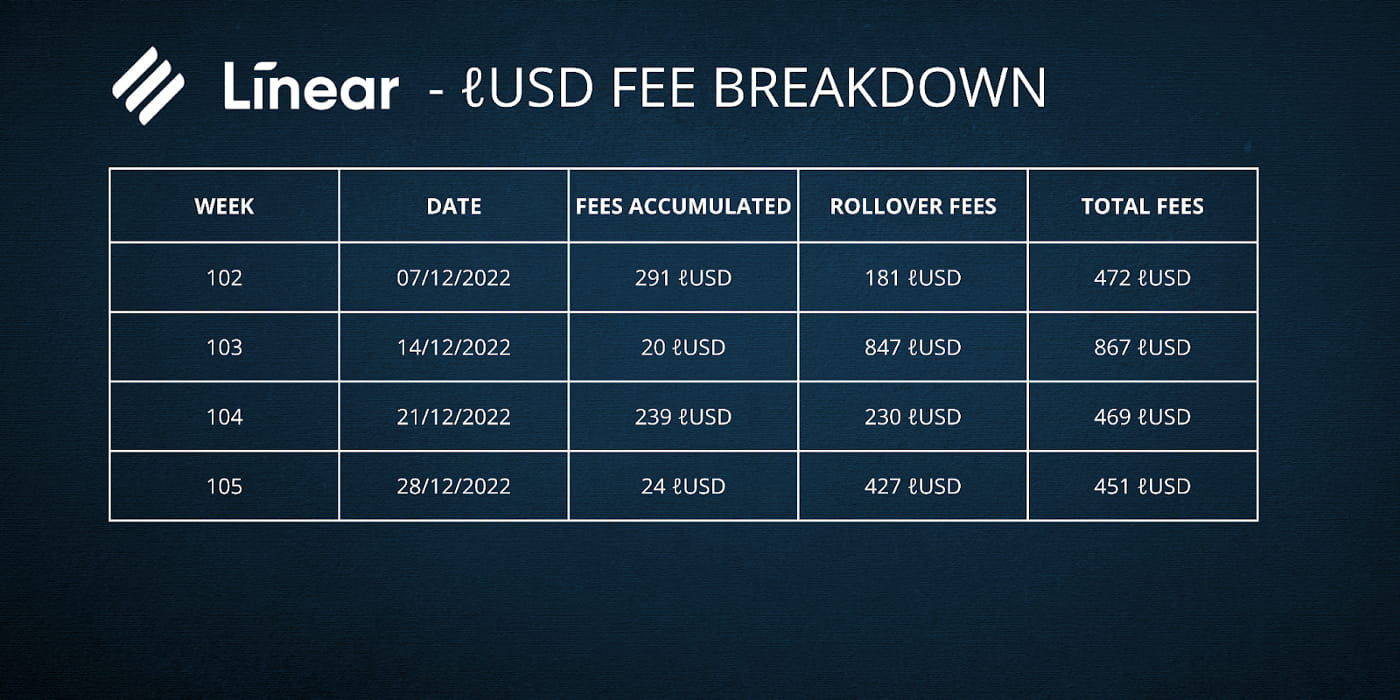 Stakery také vydělávají ℓUSD z obchodních poplatků na Linear Exchange. Obchodní poplatek je 0,25 %, z čehož 70 % jde stakerům a 30 % jde nadaci.