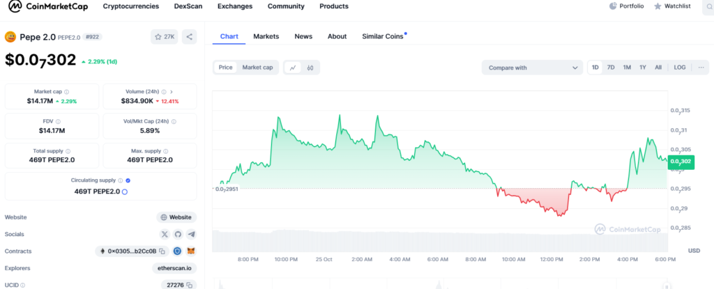 Pepe 2.0 staví na lásce internetu k ikonickému meme Pepe the Frog. S Lindyho efektem v platnosti—myšlenka, že starší myšlenky trvají déle—má Pepe 2.0 slibnou budoucnost, posílenou silnou podporou od komunity. V současnosti je cena Pepe 2.0 0,0000000294 USD, s obchodním objemem 762 755 USD za posledních 24 hodin. Pepe 2.0 je aktuálně na 930. místě na CoinMarketCap, s obíhajícím množstvím 469 trilionů tokenů, což z něj činí silného hráče na trhu memecoinů.