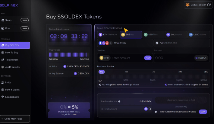 Nyní vám J bratr ukáže, jak na Solanex koupit předprodejní tokeny $SOLDEX. Nejprve přejděte na oficiální stránky, kde můžete vidět odpočet do zvýšení ceny tokenu v předprodeji, což má umožnit lidem, kteří nakoupí dříve, získat větší odměny. Klikněte na Join Presale a vstupte na stránku pro nákup, kde můžete vidět, že aktuální cena jednoho $SOLDEX v předprodeji je kolem 0.0045U, a současná částka vybraná na veřejnou nabídku tokenů již dosáhla 700 000 U. Mám pro vás dobrou zprávu, že $SOLDEX nenabídl financování ani tokeny andělským investorům a VC, a také nebudou probíhat masivní odemykání. Později se podrobněji zmíníme o ekonomice tokenů. Celkově vzato, je to velmi dobrý výchozí bod, kde je ekosystém budován komunitou, což snižuje riziko, že budete oklamáni zájmovým kapitálem.
