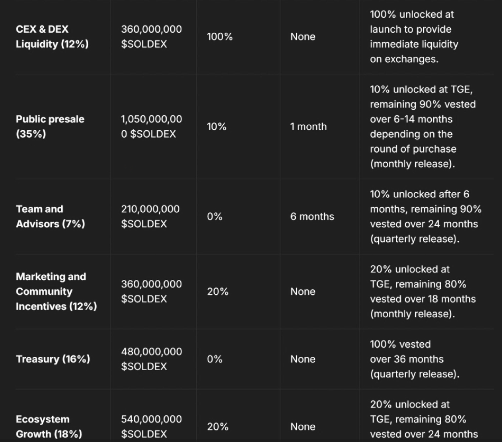 Určitě vás zajímá využití tokenu $SOLDEX. Může hrát klíčovou roli v ekosystému Solanex AI. Za prvé, nabídka likvidity, $SOLDEX lze stakovat do likviditních fondů, aby podpořil fungování platformy a získal odměny. Dále token motivuje různé aktivity, včetně poskytování likvidity, účasti na správě a zapojení do funkcí platformy. Nakonec, v budoucnu by mohlo být potřeba $SOLDEX pro přístup k některým pokročilým funkcím v Solanex AI, čímž se dále zvyšuje jeho užitečnost, takže pokud věříte v Solanex, můžete ho držet a čekat na neustálé překonávání nových maxim.
