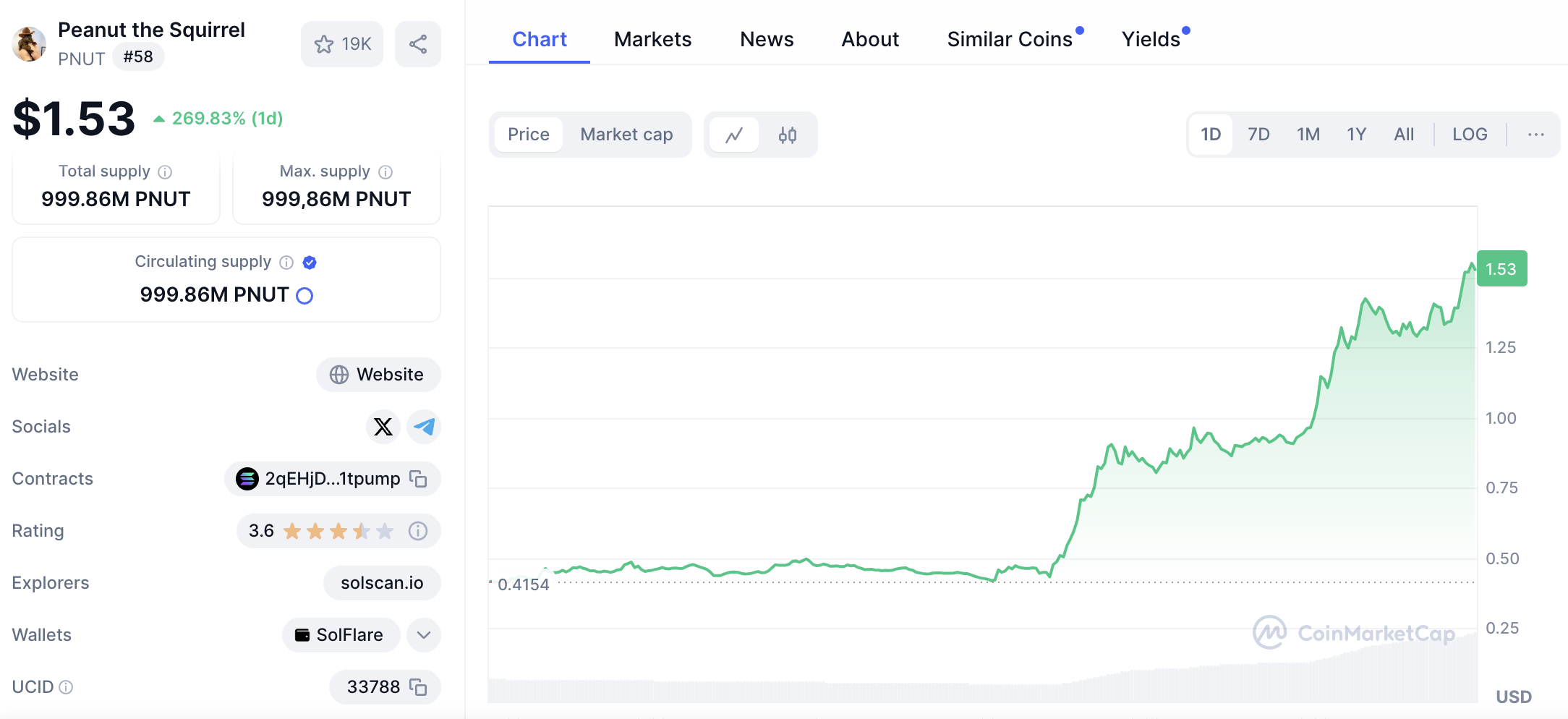 V době psaní tohoto článku je cena PNUT na 1,56 $ a zaznamenala nárůst o 230,4 % během pouhých 24 hodin.