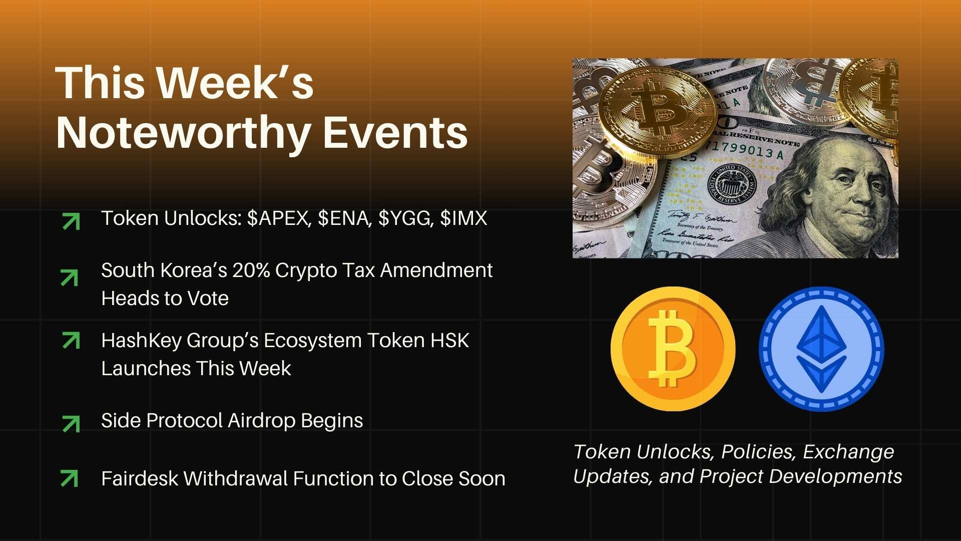 Jižní Korea plánuje zavést 20% daň na zisky z kryptoměn počínaje začátkem roku 2025. Daň, která měla původně začít platit 1. ledna 2022, byla dvakrát odložena kvůli odporu investorů a průmyslu. Upravený plán zvyšuje daňový osvobozený limit z 2,5 milionu korejských wonů (přibližně 1 795 dolarů) na 50 milionů wonů (asi 35 919 dolarů). Kromě toho novela umožňuje daňovým poplatníkům uvádět určité procento prodejní ceny jako nákupní náklady, pokud nejsou k dispozici přesné záznamy. Demokratická strana uvedla, že zvýšení osvobozeného limitu efektivně osvobodí většinu investorů od zdanění. Upravený zákon je naplánován k hlasování v daňovém podvýboru Národního shromáždění 25. listopadu, následovaném plenárním zasedáním 26. listopadu.