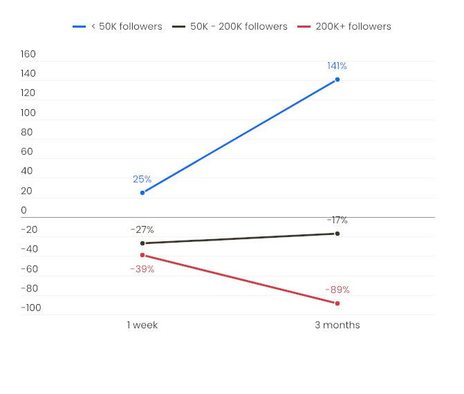 Ti s méně než 50 000 sledujícími měli lepší výsledky, přičemž jejich propagované coiny přinesly průměrný výnos 141 % za tři měsíce.