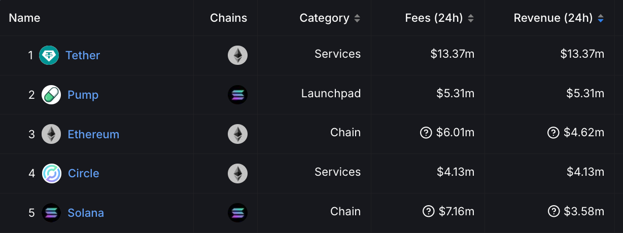 Pump.fun, platforma pro spuštění meme tokenů, zažila mimořádný růst počtu uživatelů a příjmů protokolu uprostřed rostoucího trhu s meme tokeny. Data ukazují, že Pump.fun vygeneroval 5,31 milionu dolarů na příjmech během 24 hodin, což ho zařadilo na druhé místo v denních příjmech za emitentem USDT Tether.