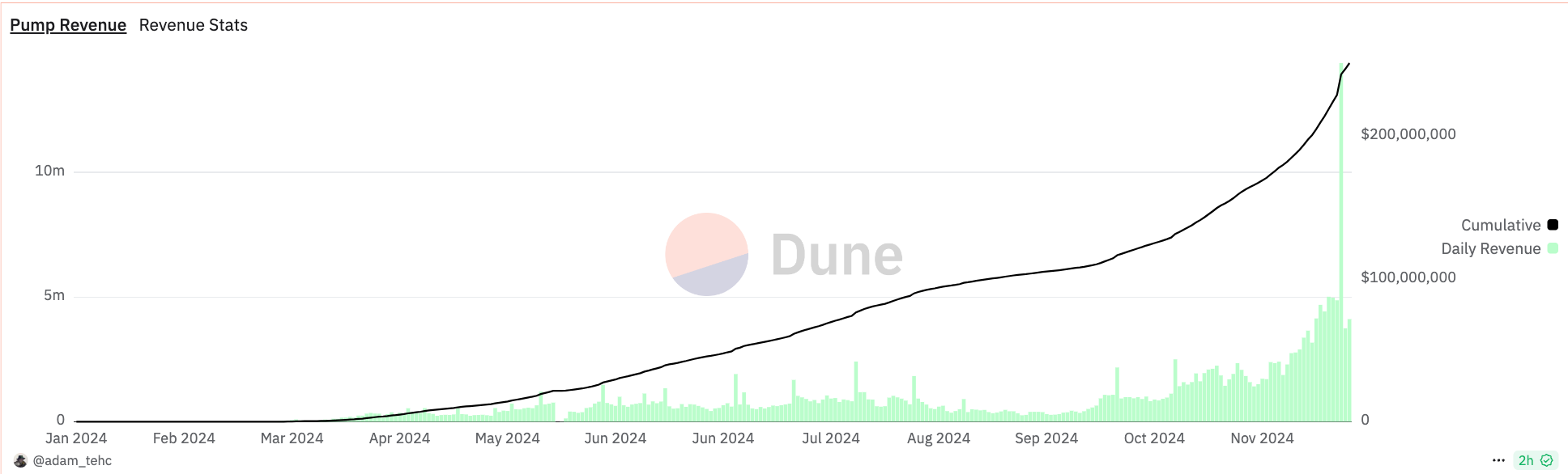 Od března zaznamenal Pump.fun stabilní nárůst aktivity uživatelů. Dosud platforma nasbírala více než 250 milionů dolarů na příjmech a nasadila více než 3,8 milionu tokenů, přičemž trendy růstu pokračují.