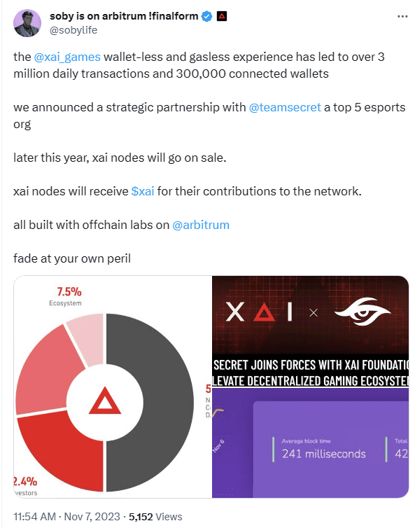 Herní platforma Xai poskytuje zážitek bez peněženky a plynu, což vedlo k více než 3 milionům denních objemů transakcí a 300 000 připojených peněženek.