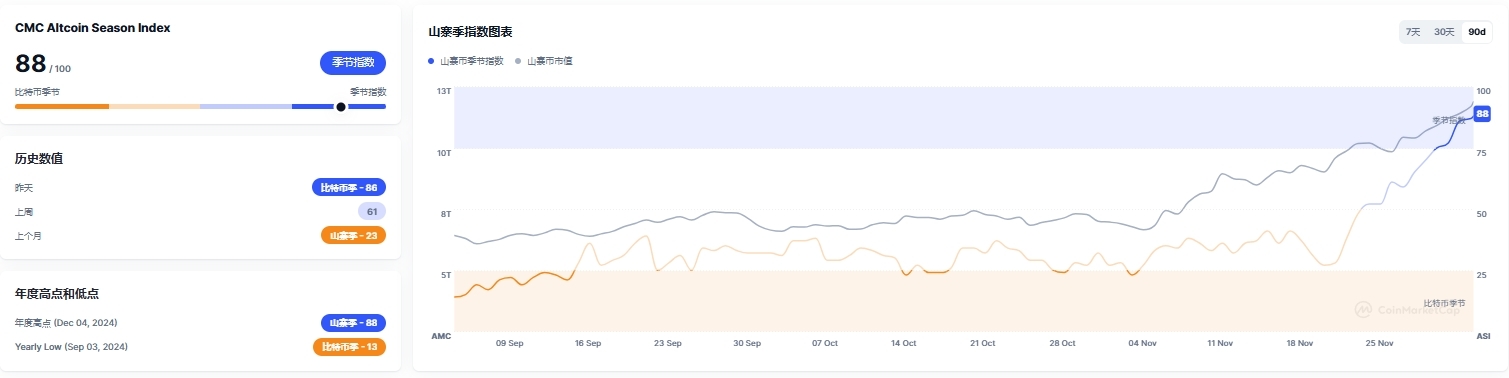Podle tohoto indexu, během posledních 90 dnů, se 88 z 100 nejlepších tokenů chovalo lépe než Bitcoin – což je bezpochyby známka příchodu sezóny altcoinů.