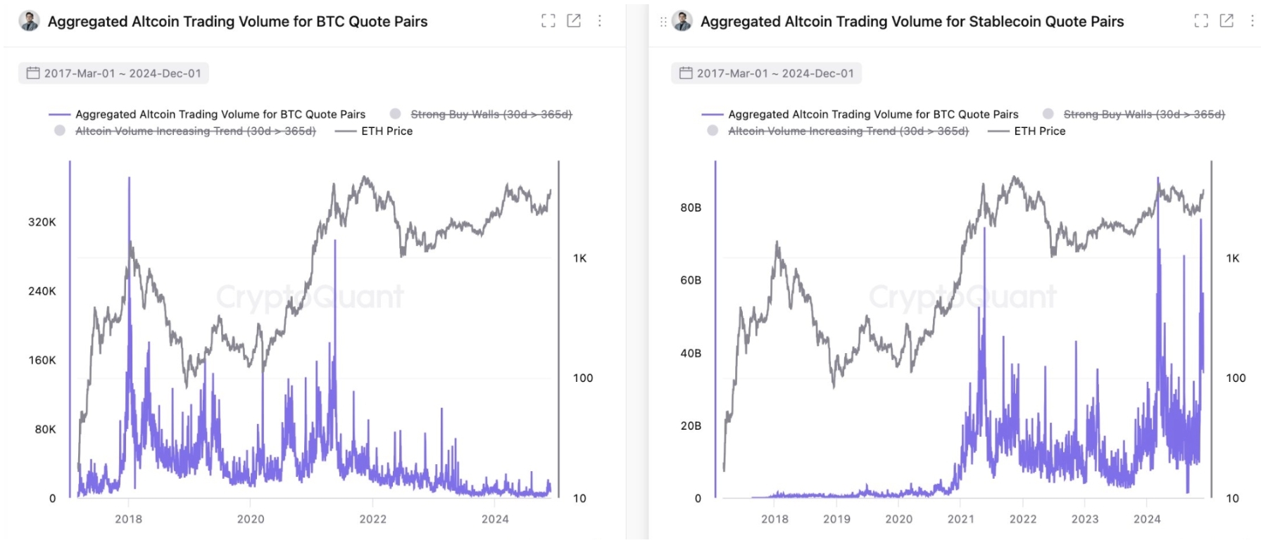 „Altseason už není definována rotací aktiv Bitcoinů.“ Zároveň graf v pravém dolním rohu ukazuje dramatický nárůst celkového objemu obchodování altcoinů ve stablecoinech, který roste současně s cenou ETH.