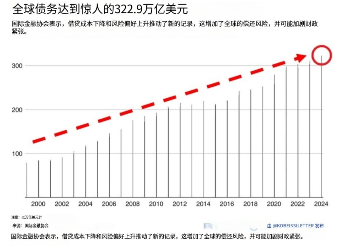 3. Ve třetím čtvrtletí 2024 oficiálně dosáhne celkový světový dluh 323 bilionů dolarů, podle dat Mezinárodního institutu pro finance #IIF vzrostl globální dluh za poslední tři čtvrtletí o 12 bilionů dolarů, za pouhých 20 let se globální dluh zdvojnásobil.