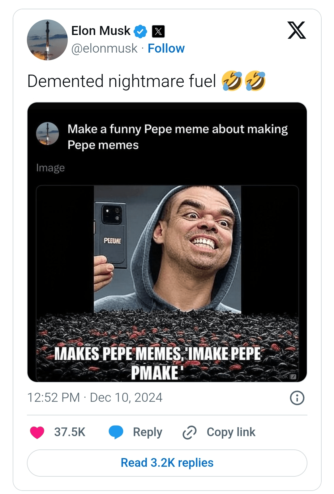 Pepe dramaticky zvýšil svou hodnotu po nepřímé podpoře, protože Elon má obrovský vliv a na sociálních médiích ho sledují miliony lidí.
