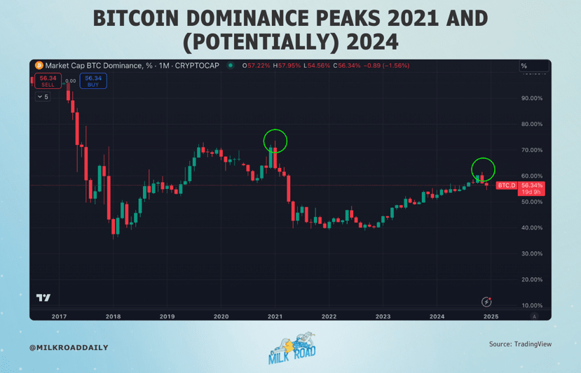 První kruh představuje vrchol BTC.D v posledním cyklu – po kterém BTC.D zkolabovalo, když začaly létat altcoiny.